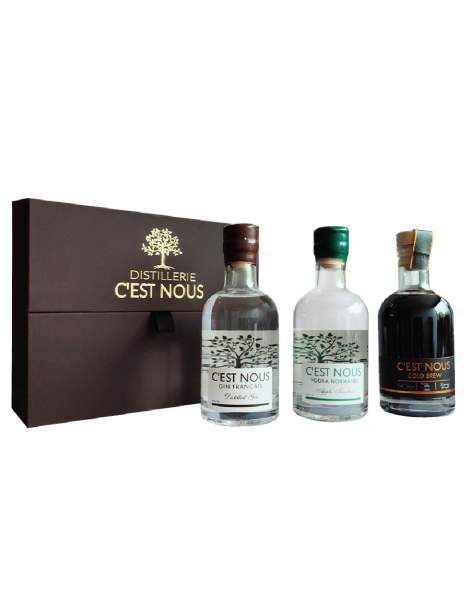 Coffret découverte 3 bouteilles de 20 cl. 20 cl Gin 20 cl Vodka 20 cl Liqueur de café Cold Brew C'est Nous distillerie artisanale dans le Calvados