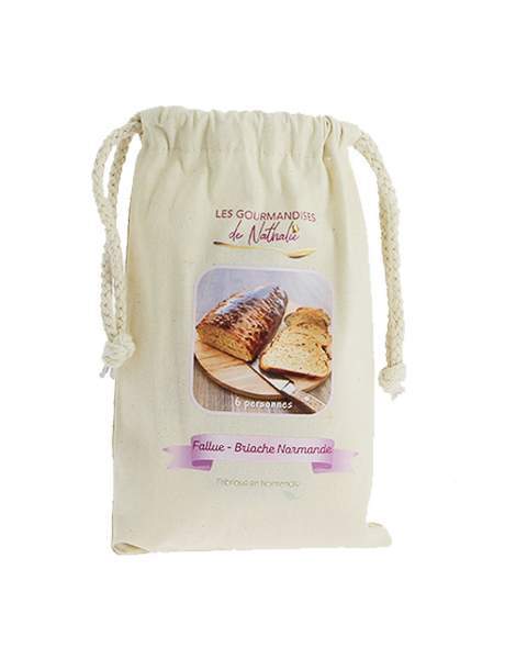 Kit d'ingrédients et recette pour la Fallue: la brioche normande Dessert du terroir normandQR code et recette en vidéo Nathalie, coach réception à Blanville-sur-Orne (Calvados) Sac en coton contenant ingrédients et QR-Code pour la recette