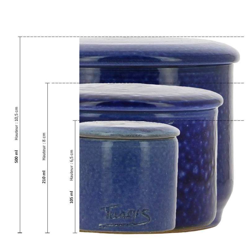 Beurrier conservateur à eau artisanalPoterie artisanale NormandePoterie Turgis à Noron dans le CalvadosEmail garanti sans plomb Contenance 350gCouleur bleu foncé Largeur: 13,00 cm Hauteur: 11,50 cm