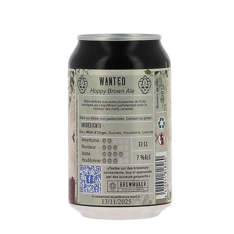 La bière "Wanted" est une bière ambrée élaborée par la brasserie artisanale Brewmaker. La "Wanted" est une bière hoppy brown ale. La Hoppy Brown Ale est un style de bière qui combine les caractéristiques d'une Brown Ale traditionnelle avec une dose supplémentaire de houblon, ajoutant ainsi des arômes et des saveurs houblonnées plus prononcées. Cette bière présente généralement des notes de malt caramel et de chocolat provenant des malts foncés, ainsi qu'une amertume et des arômes floraux ou fruités provenant des houblons utilisés. En résumé, c'est une bière brune avec une touche houblonnée supplémentaire. En effet, cette bière Hoppy brown Ale est une bière ambrée aux notes puissantes de fruits exotiques qui s'équilibrent parfaitement avec la rondeur des malts caramels.