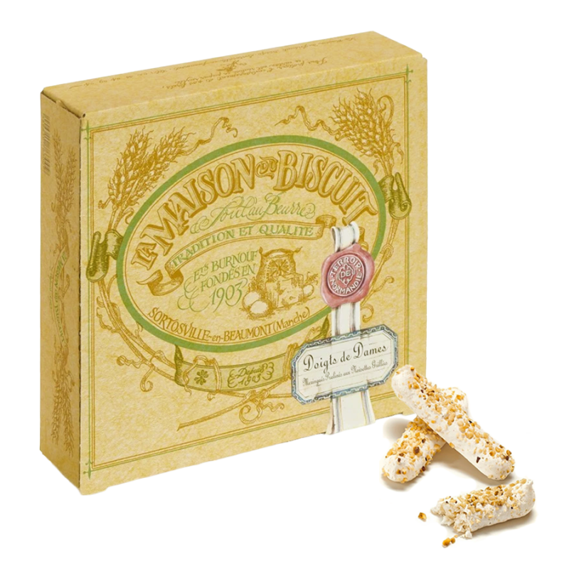Prix dégressifs :Spécialité gourmande de la Maison du Biscuit, les Doigts de Dames sont de fins biscuits meringués aux noisettes, élaborés dans les ateliers de Sortosville-en-Beaumont, dans la Manche.