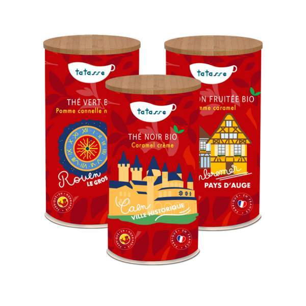 Dans ce lot de 3 thés normands, découvrez de nouvelles saveurs à travers les différentes propositions de notre marque de thés biologiques et français Tatasse. Vous profiterez de trois jolies illustrations des plus célèbres villes de la région normande : Caen, Rouen et Cambremer.