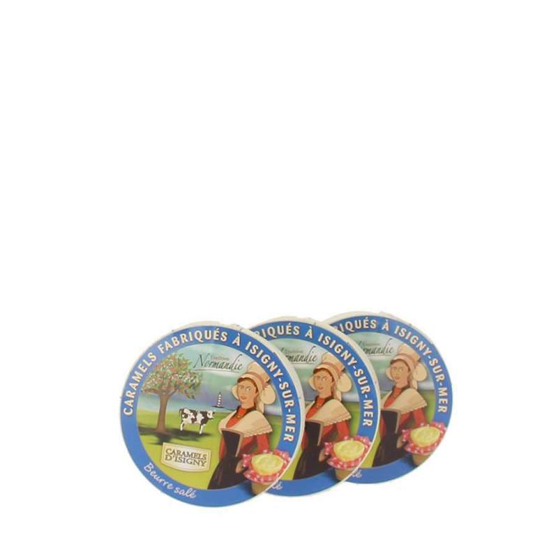 3 x 150 g 53,83 € / kgCaramels d'Isigny au beurre salé par lots de 3 boites en forme de Camembert