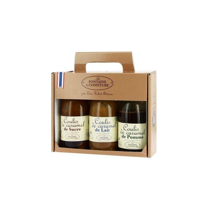 Ce coffret est composé de 3 bouteilles de 250 ml : un coulis de caramel de sucre, un coulis de caramel de lait, un coulis de caramel de pomme.
