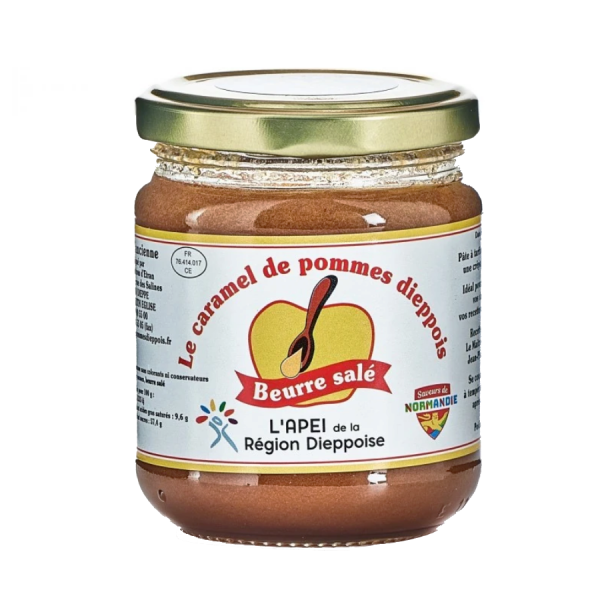 Caramel de pommes au beurre salé Fabriqué avec des ingrédients naturels et de haute qualité Parfait pour agrémenter vos desserts et recettes sucrées-salées Cuit à l'ancienne à Martin-Eglise, en Seine-Maritime (76) Les Ateliers d'Etran : APEI de la région Dieppoise