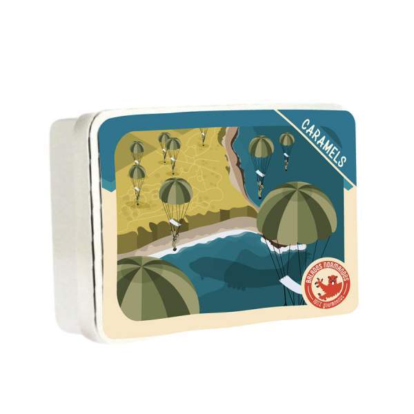 Laissez-vous tenter par nos authentiques caramels d'Isigny qui célèbrent les multiples saveurs emblématiques de notre région ! Ces douceurs incarnent véritablement l'essence de notre magnifique territoire. Vous découvrirez tout d'abord notre fameux caramel au beurre salé, harmonie subtile entre la douceur sucrée et le soupçon de sel qui évoque le caractère unique du beurre salé normand. Ces caramels sont placés dans une boîte en métal joliment illustrée en hommage au 80 ans du Débarquement, en Normandie. Ici, profitez de la vue d'en haut des parachutistes.