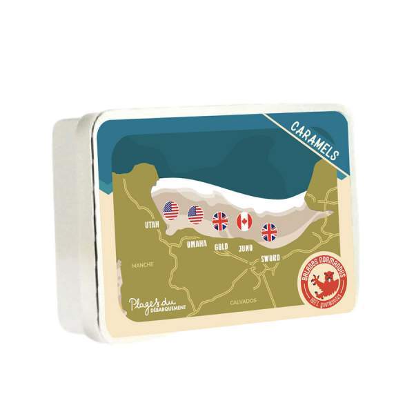 Laissez-vous tenter par nos authentiques caramels d'Isigny qui célèbrent les multiples saveurs emblématiques de notre région ! Ces douceurs incarnent véritablement l'essence de notre magnifique territoire. Vous découvrirez tout d'abord notre fameux caramel au beurre salé, harmonie subtile entre la douceur sucrée et le soupçon de sel qui évoque le caractère unique du beurre salé normand. Ces caramels sont placés dans une boîte en métal joliment illustrée en hommage au 80 ans du Débarquement, en Normandie. Ici, profitez de la vue des plages du Débarquement avec leurs noms et les drapeaux des Alliés : Utah Beach, Omaha Beach, Gold Beach, Juno Beach et Sword Beach.
