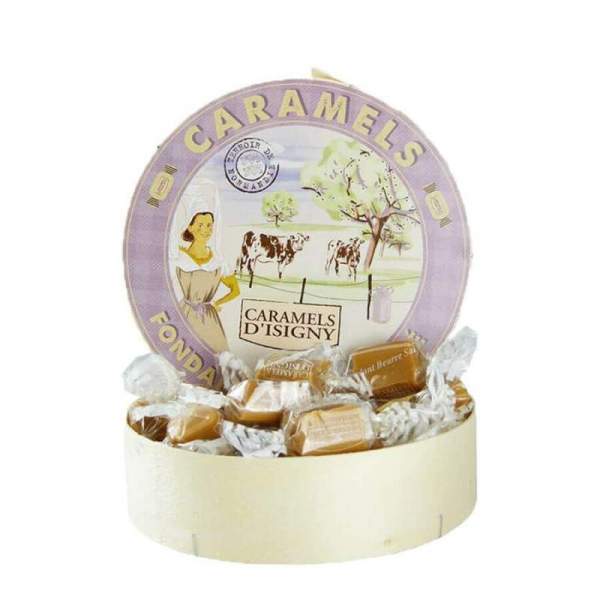 Caramel au beurre salé au sel de Guérande Les Caramels d'Isigny à Isigny-Sur-Mer (14) Boite en bois en forme de Camembert