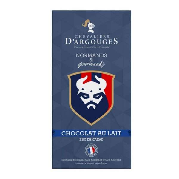 Les chevaliers d'Argouges s'associent à l'emblématique Stade Malherbe Caen, et donnent naissance à la tablette de chocolat au lait, 33% de cacao. Cette tablette au design normand plaira autant aux gourmands fans de chocolat, qu'aux aficionados du football ! Cette tablette est fabriquée artisanalement au cœur de la Normandie. Elle est sans huile de palme, et livrée dans un emballage recyclable, sans aluminium.