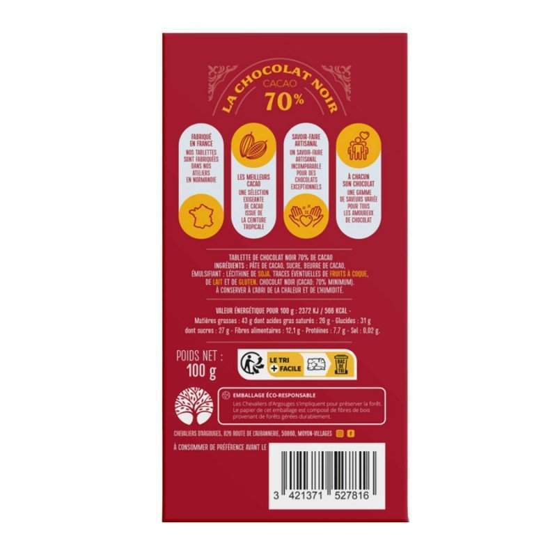 Découvrez dans cette tablette au chocolats noir tout le savoir-faire artisanal des maîtres chocolatiers normands. Sans huile de palme, et avec 70% de cacao, on retrouve dans la tablette la tradition chocolatière des Chevaliers d'Argouges, transmise de génération en génération. Elle saura ravir les papilles des gourmands : les petits comme les grands ! La tablette se trouve dans un emballage recyclable, sans aluminium ni plastique.