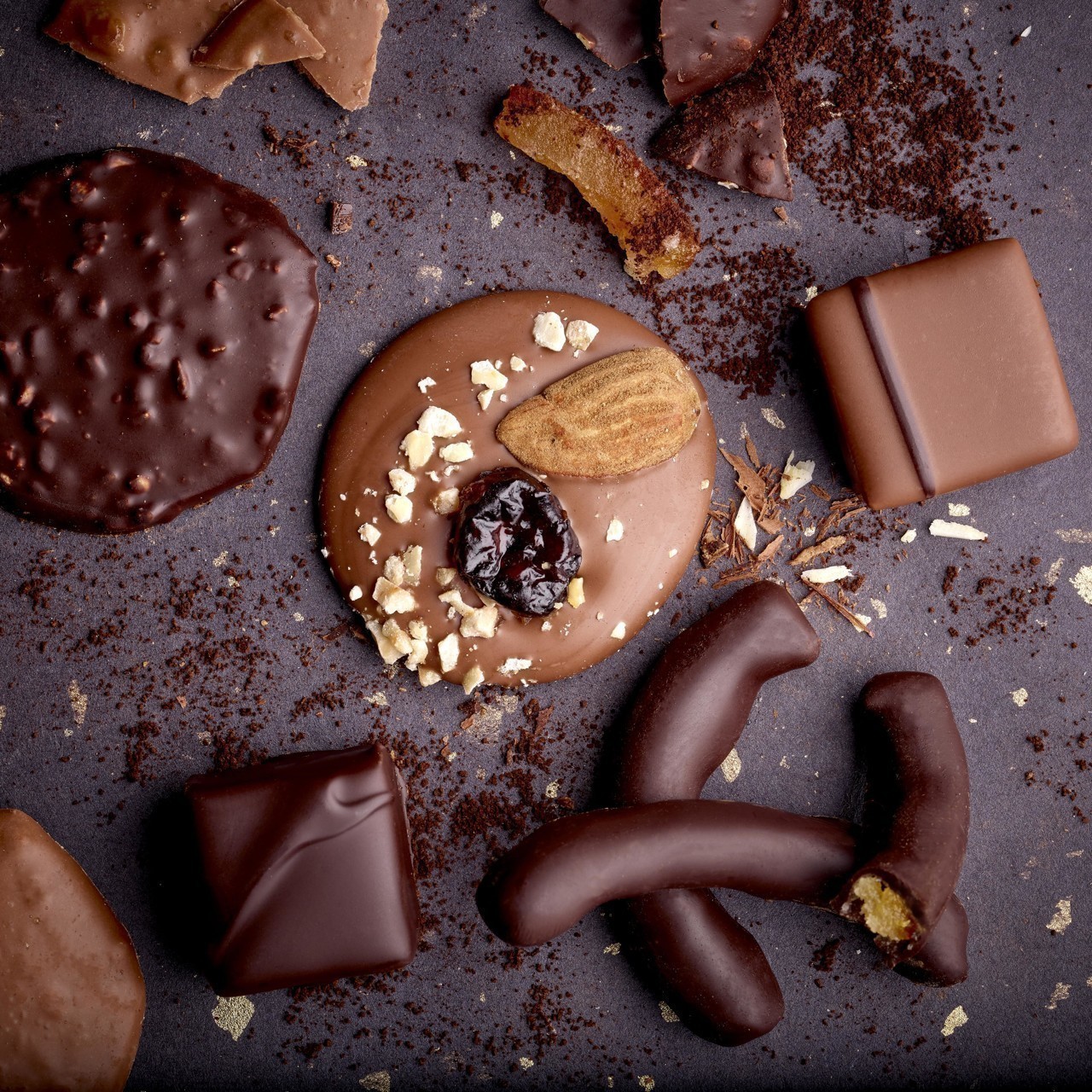 Chocolats noir, lait et blanc garnis Fabrication artisanale à Épinay-sur-Odon (Normandie) Éclats de fruits secs, caramel et spéculoos Sachet de 100g