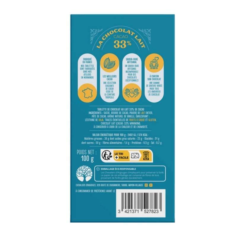 Cette tablette onctueuse est pleine de douceur ! Son goût tendre, qui fond dans la bouche, témoigne du savoir-faire des maîtres chocolatiers normands des Chevaliers d'Argouges. Les recettes se transmettent depuis plusieurs générations, et l'atelier perpétue les méthodes de fabrication traditionnelles, qui ont fait leur renommée. Sans huiles de palme, les tablettes se trouvent dans un emballage recyclable sans plastique, ni aluminium.