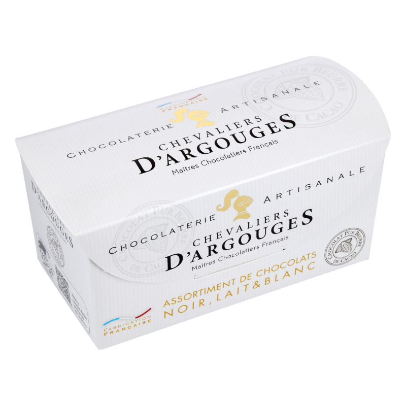 Cet assortiment de 18 chocolats des Chevaliers d'Argouges est parfait pour un cadeau ou pour les gourmands ! À l'intérieur, vous trouverez des chocolats noirs 70% de cacao, des chocolats au lait 33%, des chocolats blancs, des chocolats pralinés, et des ganaches. Il y en a pour tous les goûts ! Ces chocolats ne contiennent pas d'huile de palme.