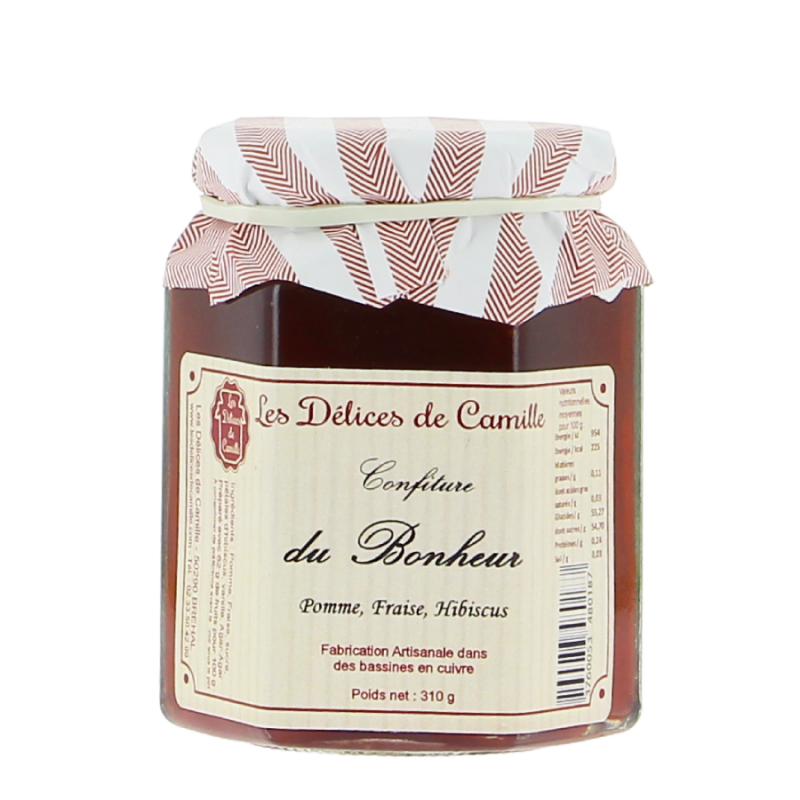 La confiture du bonheur des délices de camille est une confiture composée de pommes, de fraises et d'hibiscus. Cette confiture est une création originale et artisanale à tartiner dans la bonne humeur.