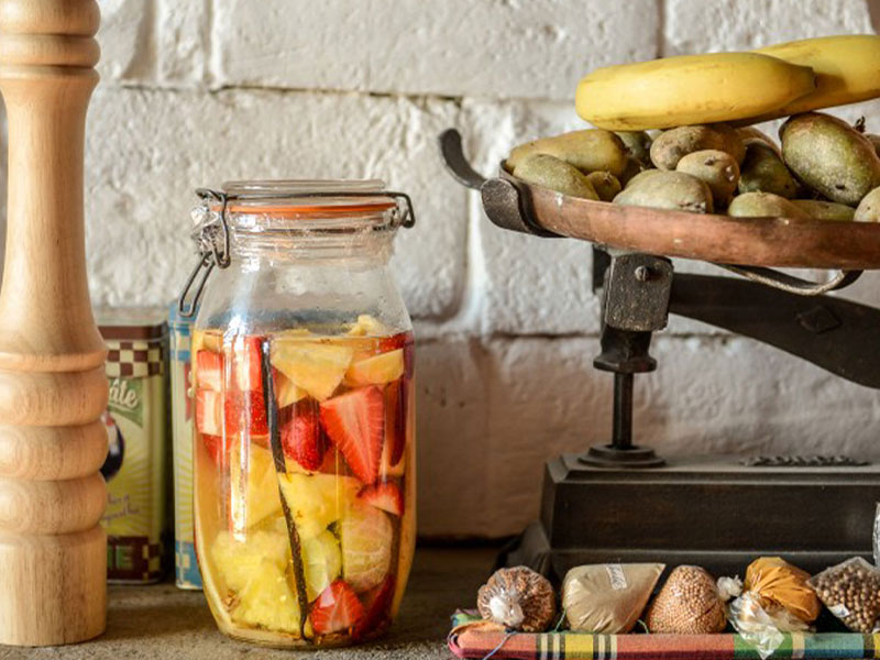 La forme a également son importance. N’oubliez pas que les fruits doivent pouvoir entrer et sortir de votre récipient. Certains fruits gonflent lors de la macération, aussi les bouteilles de vin ou de rhum ne sont pas idéales. Les bocaux de type « Le Parfait », avec leur joint caoutchouc, sont très souvent utilisés. Leur seul inconvénient étant qu’ils laissent une assez grande surface de rhum, et de fruits flottants, au contact de l’air.