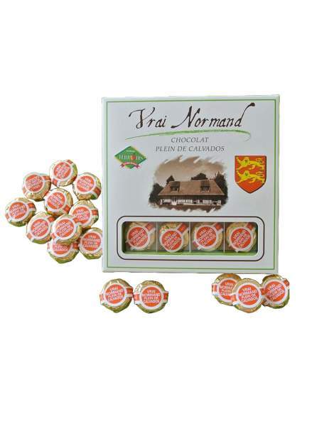 Boîte de 16 camemberts Calvados Bonbons chocolat noir fourrés de Calvados Un petit bonbon de chocolat noir au cœur de Calvados, une taille parfaite pour n'en faire qu'une bouchée...