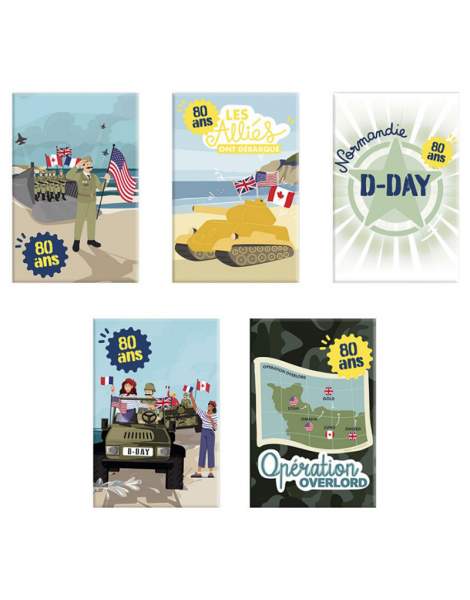 Lot de 5 magnets en métal aimantés Illustration D-Day 80 ans du Débarquement Souvenir du Débarquement en Normandie Dimensions : 5x7.5cm