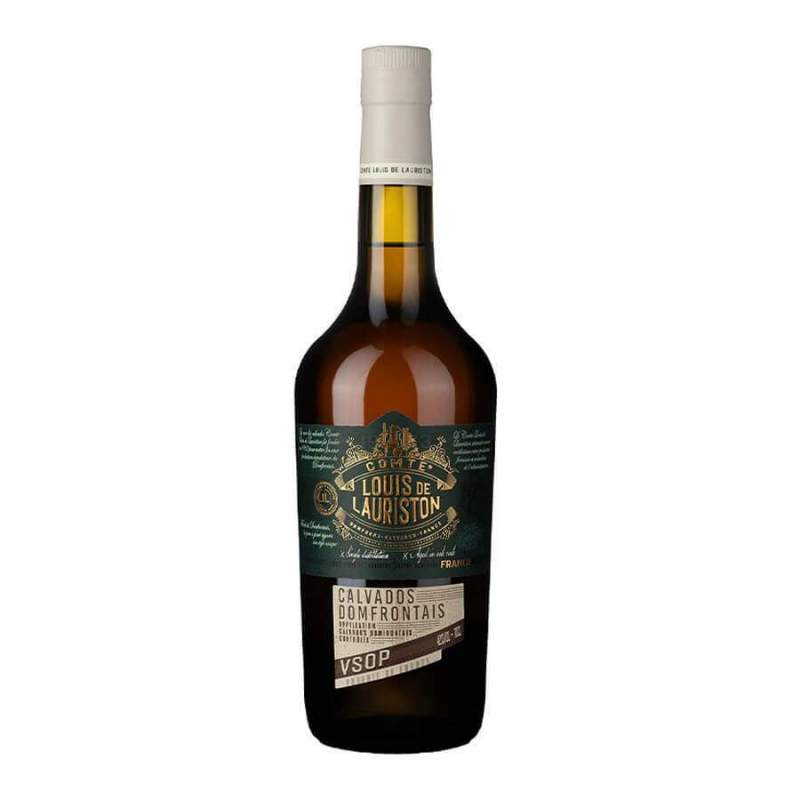 Cet AOC Calvados Domfrontais est vieilli 5 ans en fût de chêne par le producteur normand Compte Louis de Lauriston. Ce Calvados VSOP a un taux d'alcool de 42%.