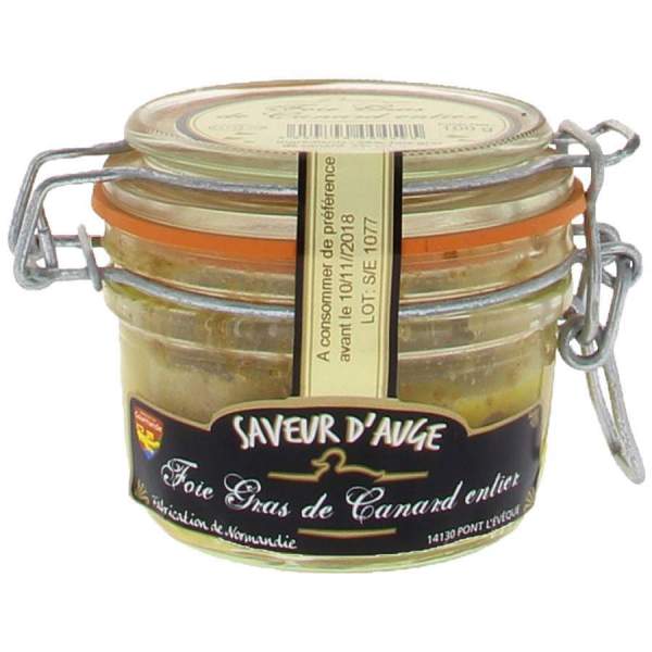 Un délicieux foie gras de canard de Normandie en bocal verre 170g fabriqué par la maison Saveur d'Auge dans le Pays d'Auge de très bon rapport qualité prix.