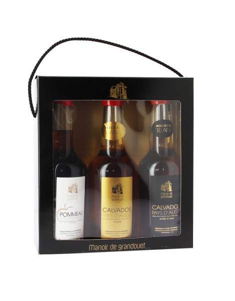 Coffret découverte de trois Calvados AOC Pays d’Auge Assemblage de Calvados de 12, 18 et 40 ans d’âge Élaborés artisanalement au Domaine de Semainville Distillation en alambic à repasse, vieillissement en fûts de chêne