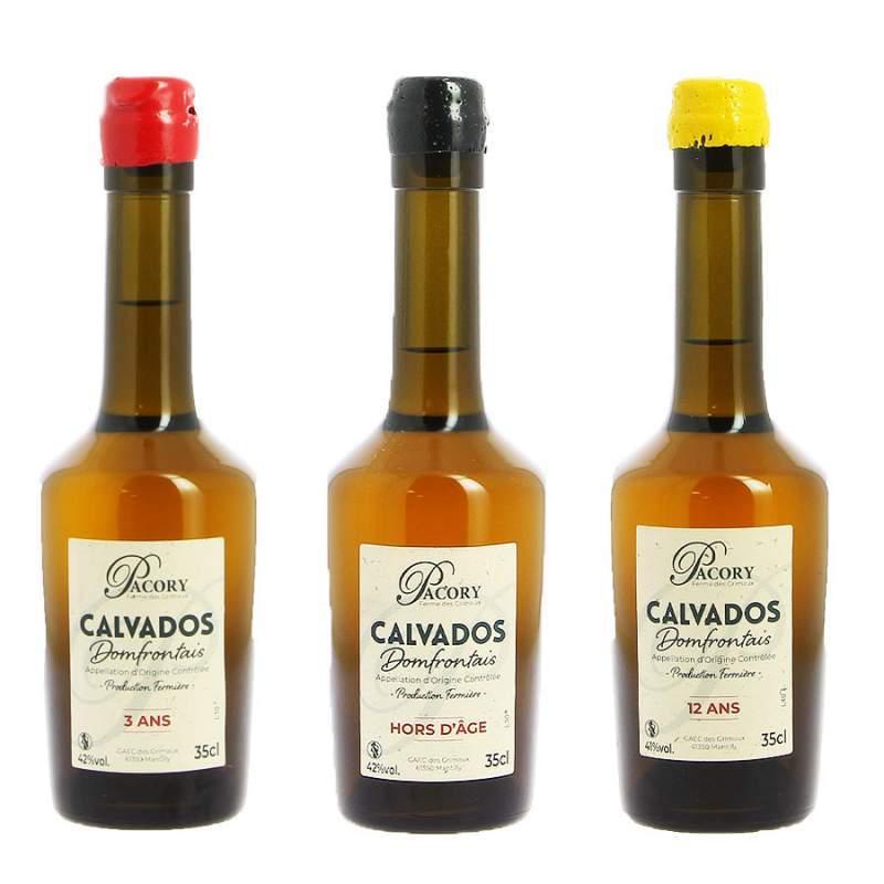 AOC Calvados Domfrontais de 16 ans, 20 ans et 30 ans Frédéric et Catherine Pacory - Production fermière du Domfrontais Ferme des Grimaux à Mantilly (Orne) Bouteille de Calvados livré en étui 3 x 35 cl