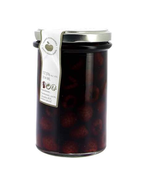 Cerises macérées dans du Calvados AOC Pot en verre de 10cl Sans arôme ni colorant ajoutés Taux d'alcool total à 12,5%