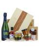 Panier garni Délices de Cabourg : Cidre effervescent, chocolat, sablés, miel, pâte à tartiner, confit de foie de Chapon et Rillettes de St-Jacques Produits fins et raffinés Prêt à être expédié aux plus gourmets de vos amis