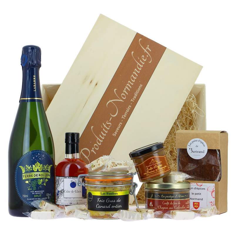 Panier garni Normand de dégustation pour toute la famille. Du sucré, du salé, il y en a pour tous les goûts dans ce magnifique coffret-cadeau. Idée de cadeau, emballé, prêt à offrir ou à faire expédier directement chez des amis.