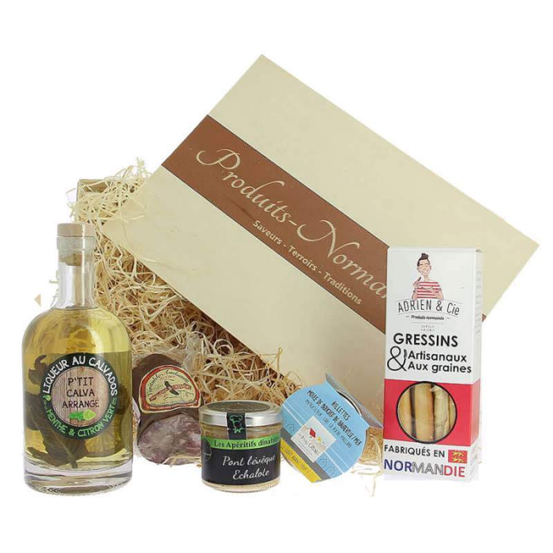 Un panier gourmand sur la thématique de l'apéritif Normand. Beaucoup de saveurs à partager, à offrir, ou à faire expédier directement chez vos amis pour un apéritif normand réussi.