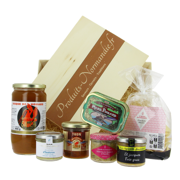 Panier garni Normand de dégustation pour toute la famille. Du sucré, du salé, il y en a pour tous les goûts dans ce magnifique coffret-cadeau. Idée de cadeau, emballé, prêt à offrir ou à faire expédier directement chez des amis.
