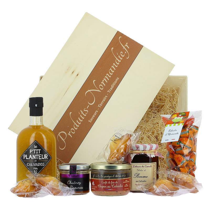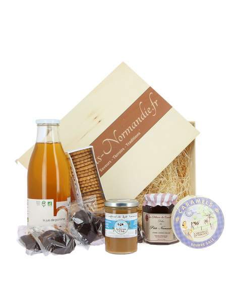 Panier garni Normand de dégustation pour toute la famille. Du sucré, du salé, il y en a pour tous les goûts dans ce magnifique coffret-cadeau. Idée de cadeau, emballé, prêt à offrir ou à faire expédier directement chez des amis.