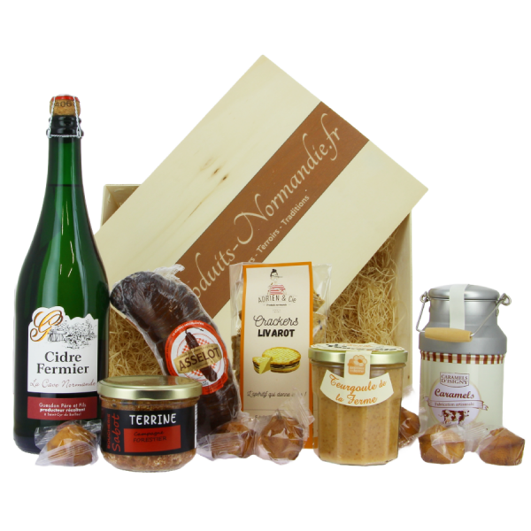 Panier garni Normand de dégustation pour toute la famille. Du sucré, du salé, il y en a pour tous les goûts dans ce magnifique coffret-cadeau. Idée de cadeau, emballé, prêt à offrir ou à faire expédier directement chez des amis.