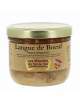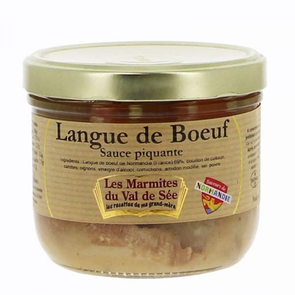 Langue de bœuf (France) 69%, bouillon de cuisson (eau, os de boeuf, oignons, carottes,poireaux, choux verts, navets, thym, laurier), carottes, oignons, vinaigre d’alcool, cornichons, amidon modifié, sel, poivre