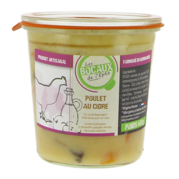Le Poulet au cidre des Bocaux de l’Epte est un plat cuisiné artisanal qui allie tradition et gourmandise. Préparé à partir de morceaux de poulet tendre et mijoté dans une sauce crémeuse au cidre normand, il révèle des saveurs douces et raffinées, typiques du terroir.