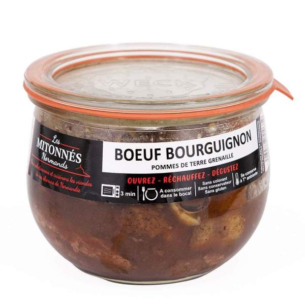 Viande de bœuf de Normandie (France) 37%,pommes de terre grenaille 25%, carottes, vin rouge (SULFITES),champignons, poitrine de porc fumée en lardons (France), concentré de tomates, échalotes, beurre (LAIT), farine de blé (GLUTEN), sel, poivre, muscade.