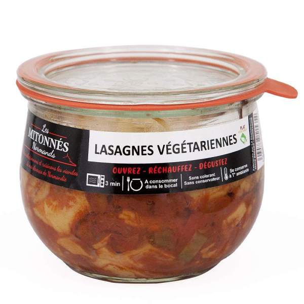 Bolognaise végétarienne 58% [ratatouille,oignons, concentré de tomates, carottes, poivrons lanières, vin blanc (SULFITES), sel, herbes de Provence, ail, poivre], pâtes à lasagne 13% (semoule de BLE dur), béchamel [LAIT, beurre (LAIT), farine de blé (GLUTEN), sel, poivre], fromage râpé (LAIT).