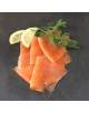 Tranches de saumon normand fumé Salage et fumage léger Salé au sel sec - Fumé à la ficelle au bois de Hêtre 7/8 tranches de saumon qualité traiteur coupé à la main - 240g (+/- 10g) Date Limite de Consommation à la livraison : 21 jours minimum