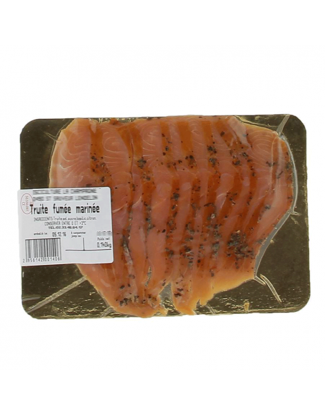 Truite fumée marinée basilic tranchée Truites élevées dans la grande rade de Cherbourg Artisan fumeur de Normandie Truite de ST SAUVEUR LENDELIN. Salé au sel sec - Fumé à la ficelle au bois de Hêtre Tranché à la main - 5 tranches qualité traiteur Filet de truite fumée et marinée au basilic prétranché de 140g (+ ou - 5g) DLC 20 jours