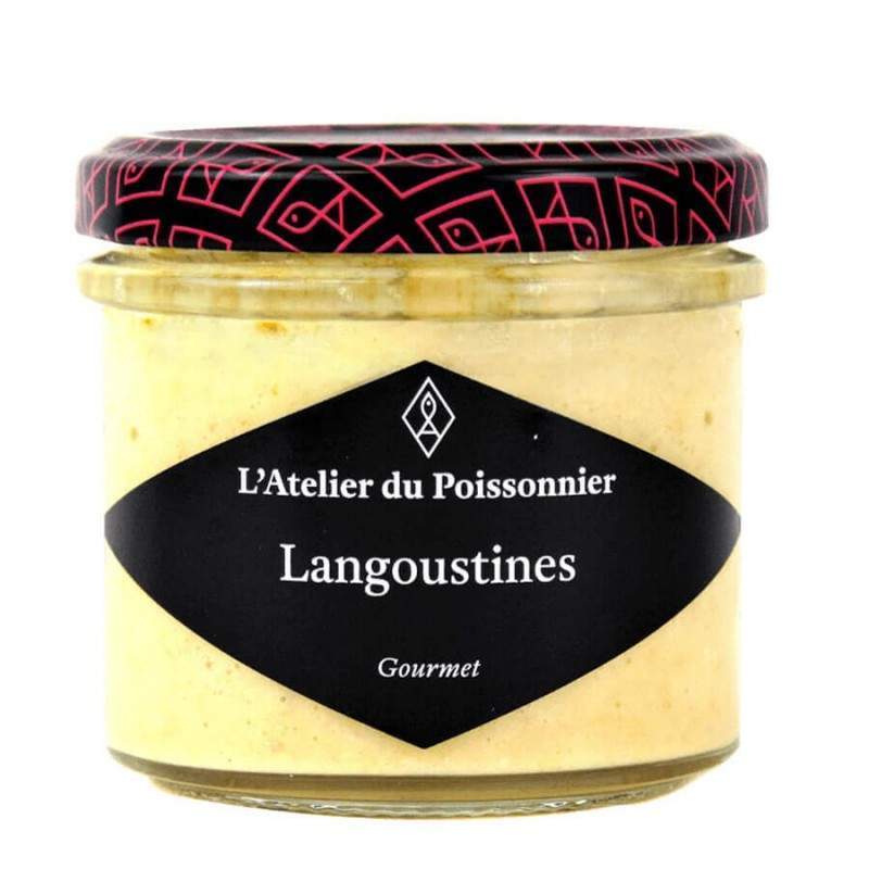 Crème (lait), saumon 34%, chair de langoustines 22 %, jus de citron, fleur de sel, gélifiant : agar-agar Traces possibles d'arêtes.