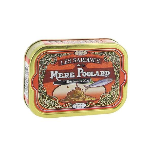Sardines millésimées à l'huile d'olive Fabrication artisanale normande La mère Poulard 115g Boite métal jaune