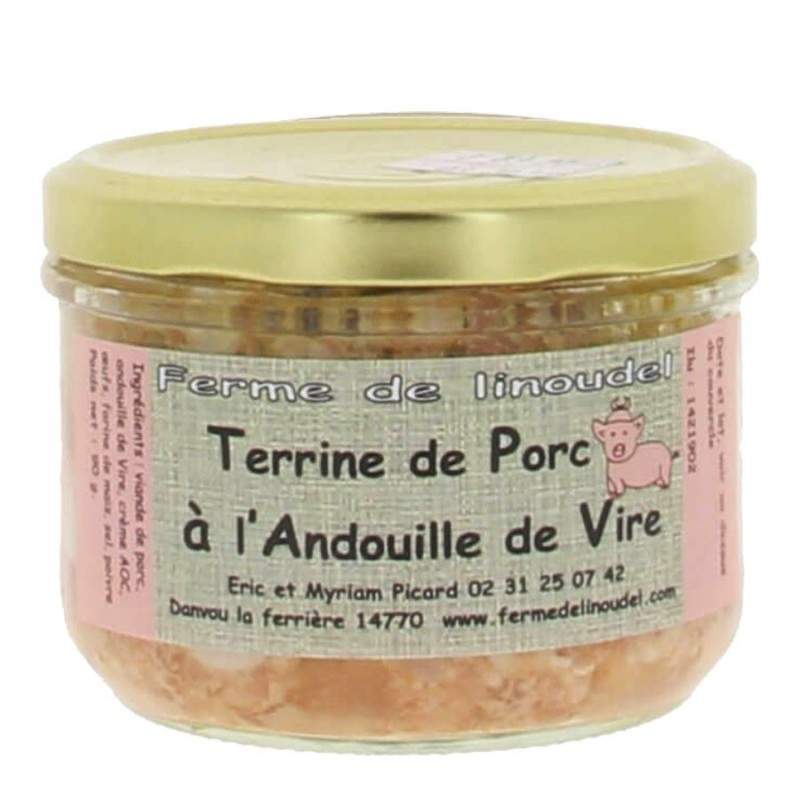 Cette recette est l’alliance de deux savoir-faire charcutiers emblématiques de la Normandie : la terrine de campagne au bon goût de viande et l’andouille de Vire au goût unique, fumée au bois de hêtre.