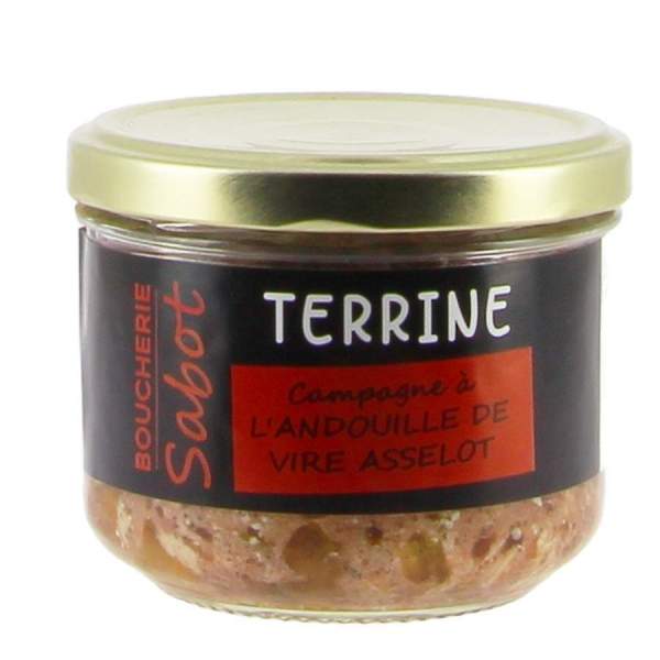 Grâce à l'excellence de la Boucherie Sabot, vous dégusterez une terrine aux associations idéales. Le charcutier a élaboré sa terrine en alliant les saveurs de l'oignon, du foie de porc, du persil et pour compléter, l'unique Andouille de Vire Asselot. Le secret de cette terrine se découvre lors de la dégustation. Le goût fumé de l'Andouille reste discret malgré le caractère qu'il en ressort.