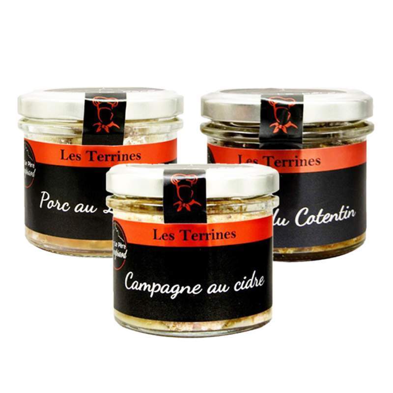 Lot de 3 pots de terrines du Père Roupsard d'une contenance de 180g. Chaque lot est composé de 3 terrines de saveurs différentes à base de porc.