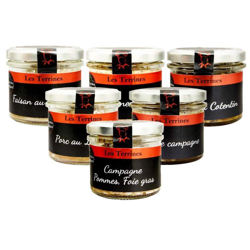 Lot de 6 pots de terrines du Père Roupsard d'une contenance de 180g. Chaque lot est composé de 6 terrines de saveurs différentes mais avec une spécialité normande.