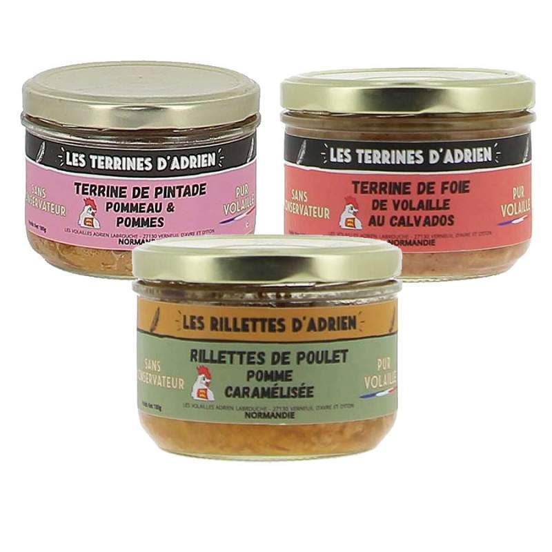 Succombez à notre lot de 3 terrines au choix, des rillettes fondantes à base de volailles qui régaleront vos papilles. Créées par Adrien & Cie dans l'Eure (27), ces terrines vous offriront une expérience gustative authentique et savoureuse. Profitez de la finesse des saveurs normandes à chaque dégustation.
