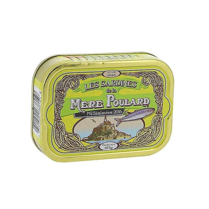 Sardines millésimées à l'huile d'olive Fabrication artisanale normande La mère Poulard 115g Boite métal bleue