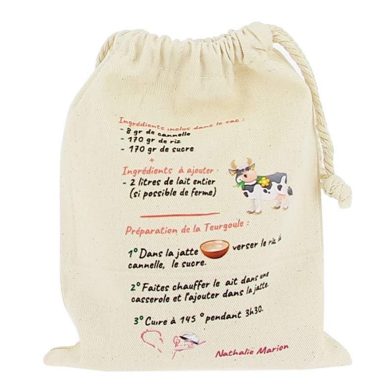 Sac en coton contenant cannelle, riz, sucre et QR-Code pour la recette