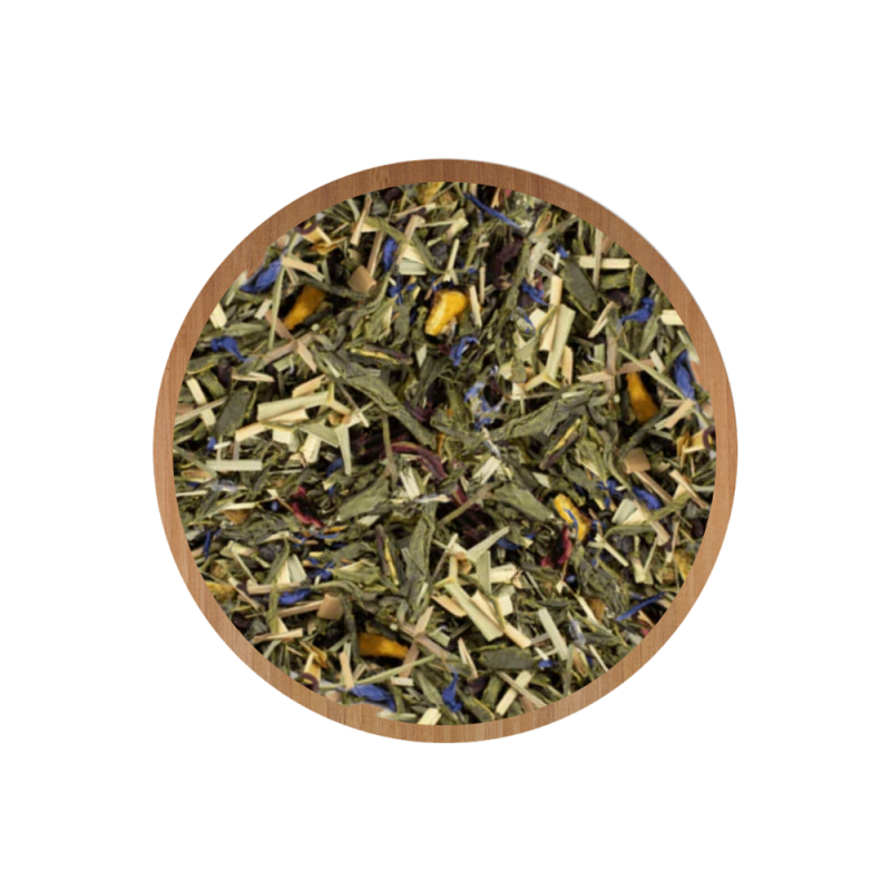Thé vert Sencha* (Chine), thé vert Chun Mee* (Chine), fleurs d'hibiscus*, citronnelle*, arôme naturel de grenade, thé blanc Pai Mu Tan* (Chine), arôme naturel d'orange sanguine, écorces de grenade* (1%), morceaux d'orange sanguine* (1%), morceaux de mandarine* (1%), fleurs de bleuet*, huile de mandarine*. *issu de l'agriculture biologique contrôlée