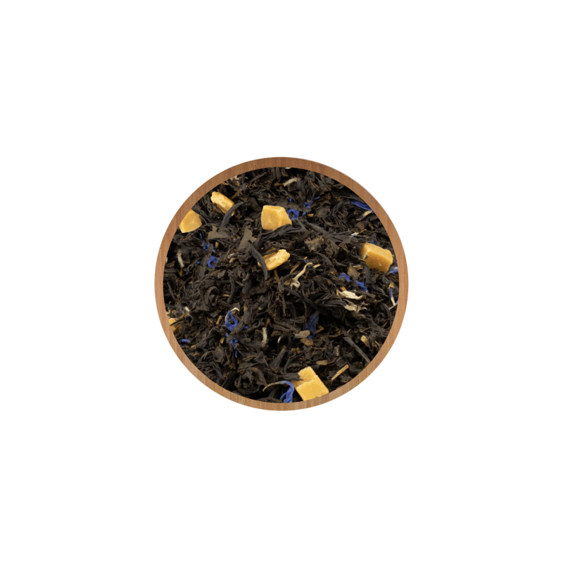 Mélange de thé noir*, thé noir Assam*, thé noir Ceylan*, arôme naturel de caramel, arômes de crème naturel, morceaux de caramel*, fleurs de bleuet*. *issu de l'agriculture biologique contrôlée