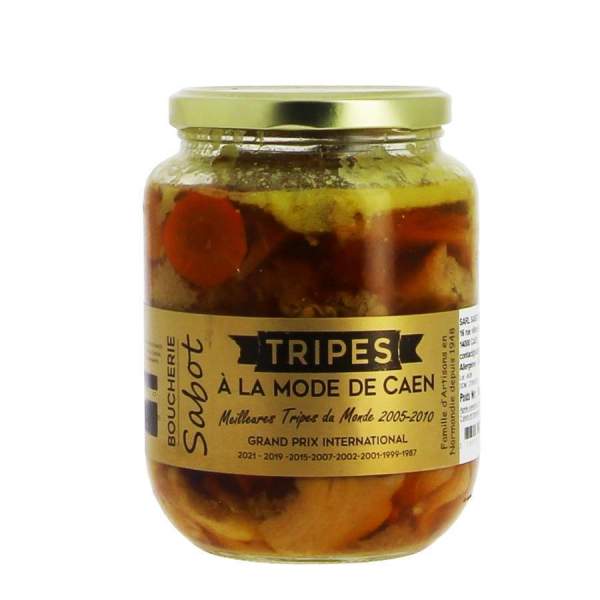 Les véritables tripes à la mode de Caen du producteur Sabot se démarquent par leur viande tendre. Elues meilleures tripes du monde en 2005 et une nouvelle fois en 2010 au grand prix international, elles sé dégustent accompagnées de frites ou de pommes de terres grenailles. Les tripes et pieds de boeufs composant ce format 780g ont été sélectionnés et vérifiés par le charcutier réputé de la Boucherie Sabot à Caen, en Normandie. Elles ont été élaborées de la façon traditionnelle des tripes à la mode de Caen.